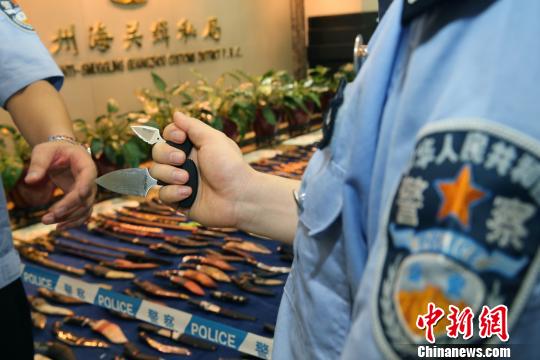 在销毁现场,工作人员首先拆开外包装进行粉碎,伴随着巨大的轰鸣声,工作人员操控着几台大型的高温燃气切割机器陆续切割开走私管制刀具的刀身和刀把,现场溅起切割产生的高温火花。