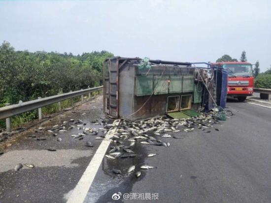 8月8日上午9点55分,在长沙绕城高速北段,一台赣A牌照的货车发生侧翻,横在高速路面上,货车水箱里2吨左右的鲜鱼倾撒而出,散落在路面上。由于天气太热,2吨活鱼很快就被晒死,交警赶到后,对路面开展交通管制,并协助货车车主清理现场,经过一个多小时的现场救援,道路交通恢复正常。