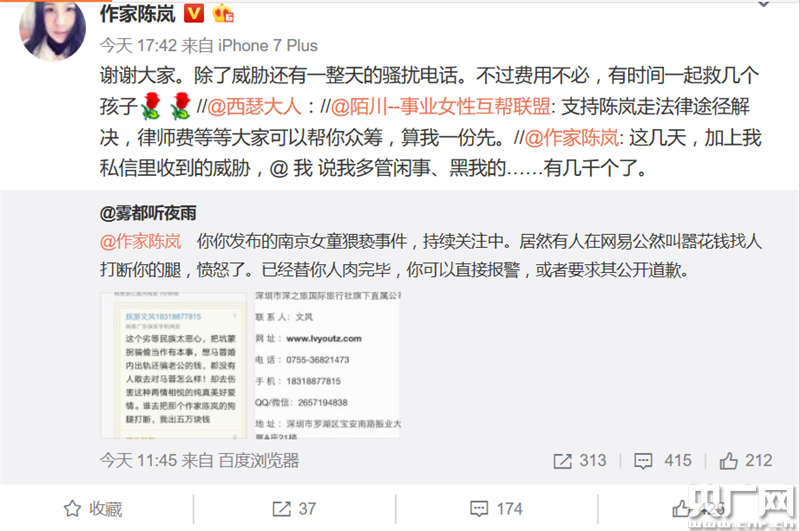 “有网友说我多管闲事……”。但她并不在意,还在微博上调侃网友关于“恋童癖是两情相悦”的说法,“这个威胁还算有点新意。”陈岚还告诉记者,也有人声援她,“人肉”搜索出咒骂她的网友,并贴出该网友联系方式,让其通过法律手段维护自己的权益。