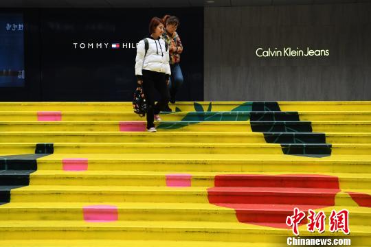 12月14日,重庆杨家坪步行街上一室外台阶被装饰成五颜六色,绚丽的彩色吸引路人。