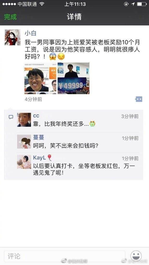 近日,杭州某公司员工因长期霸占公司打卡笑容榜榜首,被老板评为模范员工,并奖励10个月工资。老板称其笑容很感染人,能为公司带来正能量。