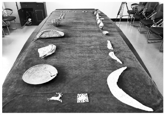 图为青海警方展示部分追缴回的热水墓群被盗掘出土文物。