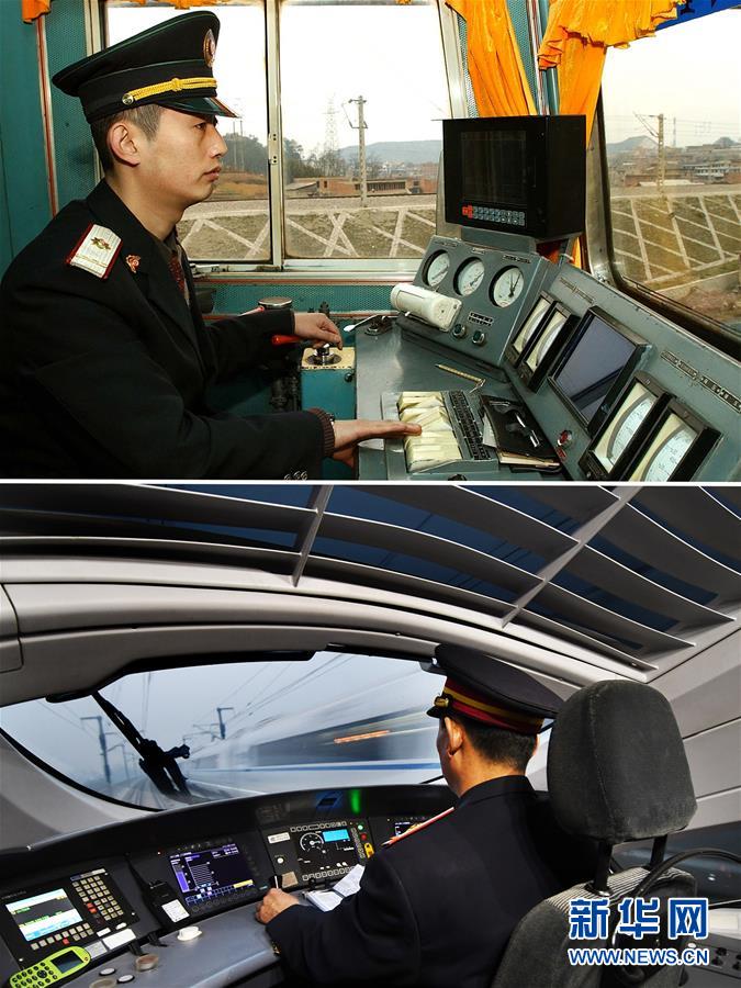 这是一张拼版照片,上图:2004年2月5日,贵阳铁路分局贵阳机务段司机张欣正在驾驶机车(新华社记者侯少华摄);下图: 2017年1月25日,高铁司机周立驾驶由北京南至天津的列车(杨宝森摄)。新华社发