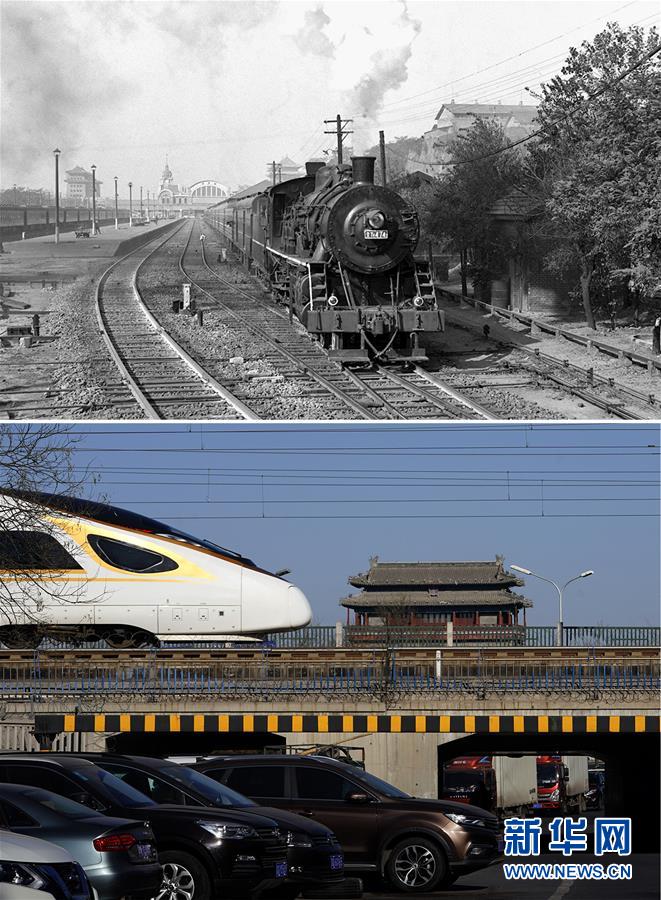 这是一张拼版照片,上图:1957年10月14日,北京-广州首次直达列车从北京车站开出(新华社记者孟庆彪摄);下图:2019年1月25日,一列复兴号动车组列车在北京永定门城楼附近的京津城际铁路上行驶(新华社记者邢广利摄)。新华社发