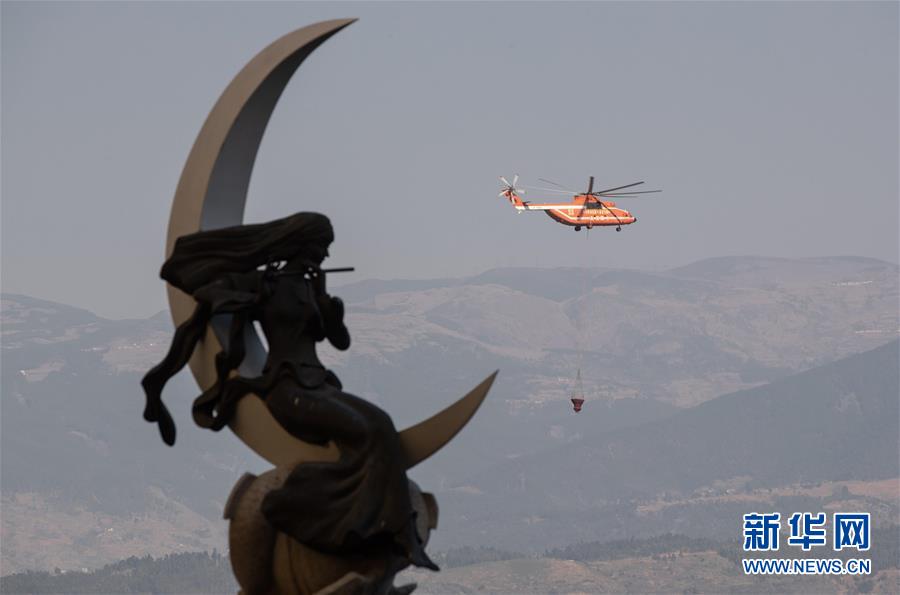 3月31日,一架参与西昌森林火灾灭火的直升机在邛海中取完水飞向火场。 3月30日,四川凉山州西昌市突发森林火灾。截至3月31日16时,火灾过火面积1000余公顷,毁坏面积80余公顷,已造成19人遇难。目前,西昌森林火灾的扑火救援工作仍在紧张有序地进行。新华社记者江宏景摄
