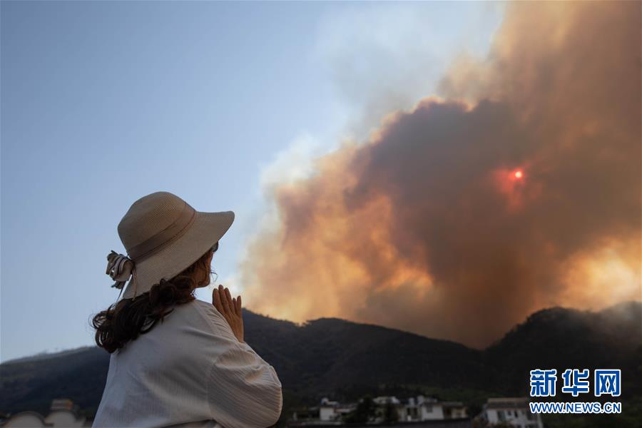 3月31日,一名女士远望着火灾现场祈祷。 3月30日,四川凉山州西昌市突发森林火灾。截至3月31日16时,火灾过火面积1000余公顷,毁坏面积80余公顷,已造成19人遇难。目前,西昌森林火灾的扑火救援工作仍在紧张有序地进行。新华社记者江宏景摄