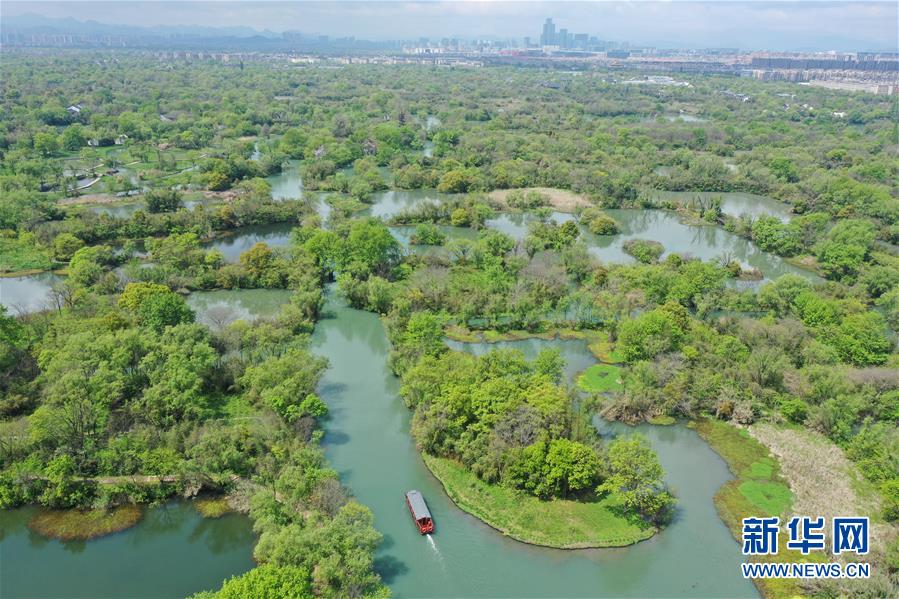 游船行驶在杭州西溪湿地水道上(4月1日摄)。新华社记者翁忻旸摄