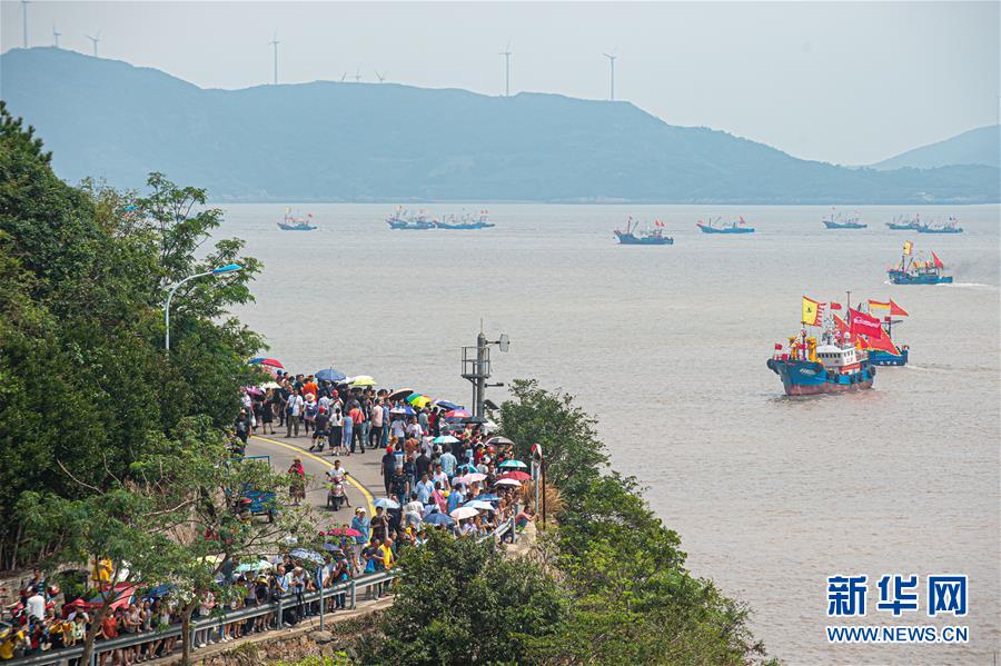 9月16日,游客在浙江象山石浦渔港观看开渔盛况。 9月16日12时起,中国东海结束为期四个半月的伏季休渔,全面开渔。新华社发(江汉摄)