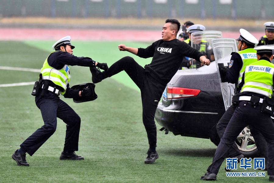11月17日,在济南市公安局济南特警支队训练场,干警在进行重点交通违法行为智慧查缉展示。新华社记者郭绪雷摄