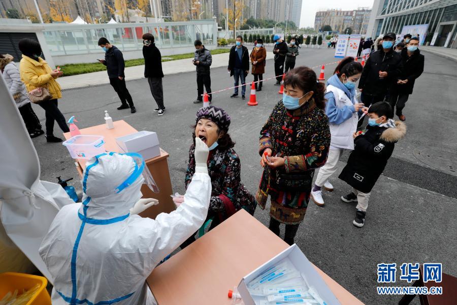 12月10日,在郫都区中医医院核酸检测点,医务人员对居民进行核酸取样。